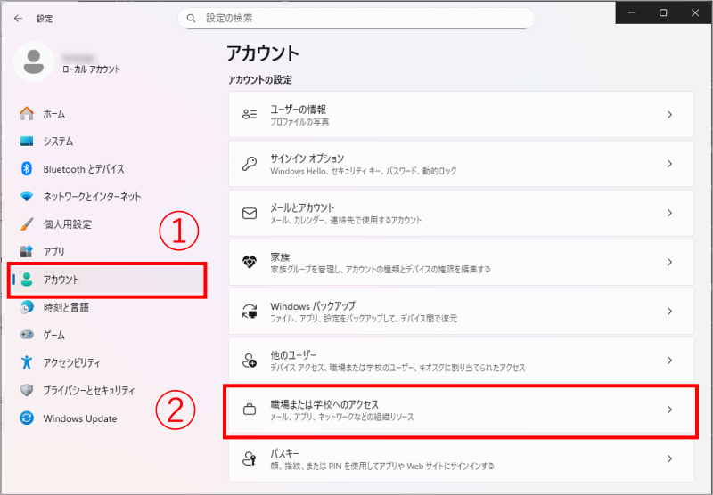 - キーボードの【 Windows ロゴ 】+【 I 】キーを押して「設定」を開き、「アカウント」⇒「職場または学校にアクセスする」をクリックします。