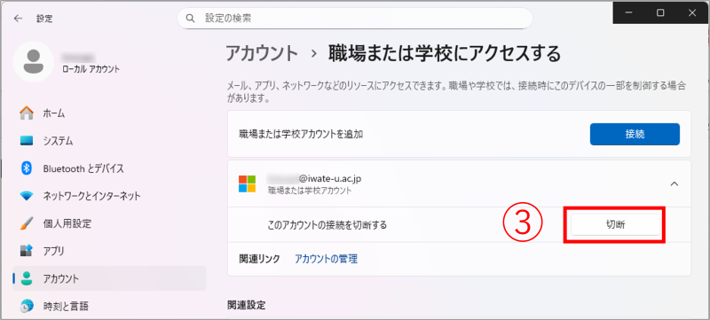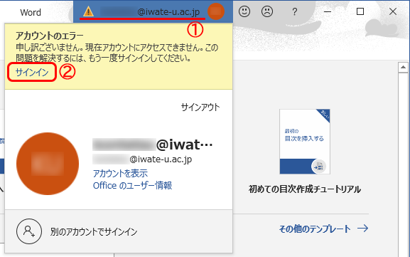 右側に、岩手大学のメールアドレスで「職場または学校アカウント」が表示されているので「切断」をクリックします。 - Wordを立ち上げると上方に「!」マークが表示されているので、クリックして「サインイン」へ進みます。