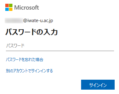 - 情報基盤センターシステムアカウント(例. メール等)のパスワードを入力し「サインイン」をクリックします。