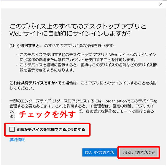 - 以下の画面が表示されるので「いいえ、このアプリのみにサインインします」をクリックします。