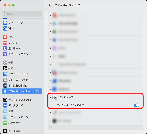 Macの「システム設定」を開き、「プライバシーとセキュリティ」の「ファイルとフォルダ」一覧から、「インストーラ」をクリックします。