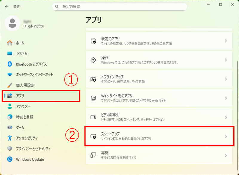 キーボードの【 Windows ロゴ 】+【 I 】キーを押して「設定」を開き、「アプリ」⇒「スタートアップ」をクリックします。